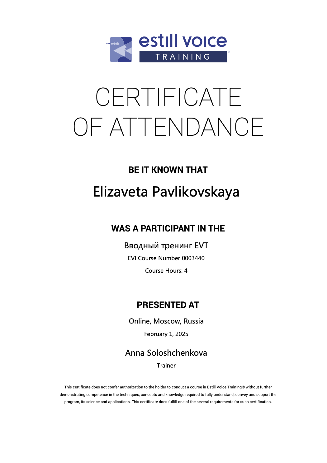 Моя уникальность - в глубине восприятия Мира и необычном взгляде на привычные вещи. Я помогаю открыть новые грани себя, выразив их через голос и творчество, раскрыть потенциал личности через налаживание связи между телом, психикой и душой. Подбор инструментов и техник всегда индивидуален - это не только голос, но и рисунки, движение, слова, символы, образы. В пространстве, которое я создаю, легко быть Собой - настоящей, уязвимой, открытой новому.